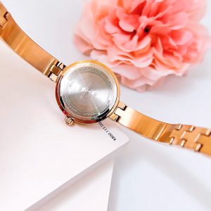 Tone rose sang trọng. Điểm ấn tượng của ĐH nằm ở cách trang trí các viên đá swarovski chạy giữa 2 dây, mặt đh và trên 4 điểm chỉ giờ