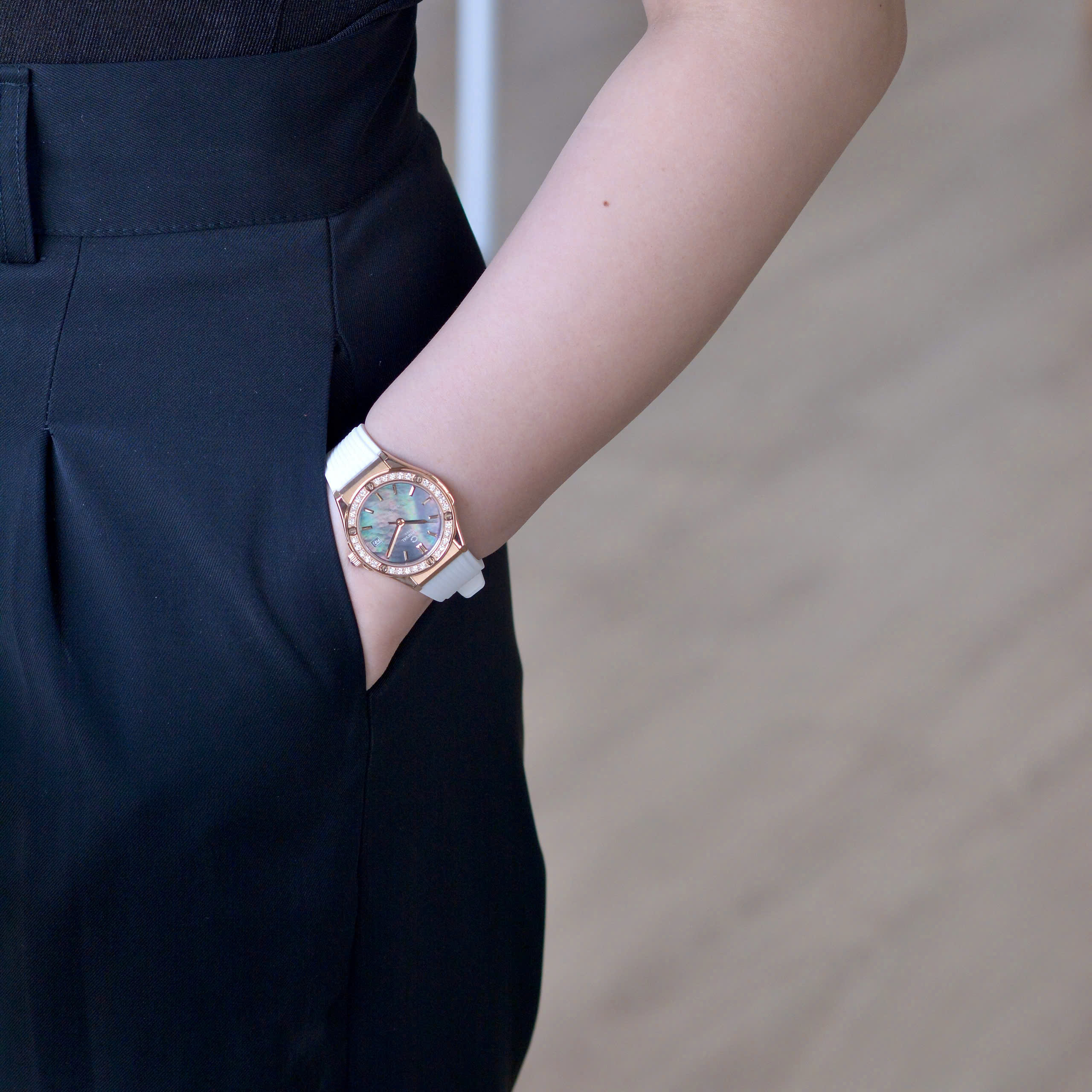 • Mặt khảm hồng sang chảnh, kết hợp viền trắng đá hiện đại, form dáng tựa chiếc Hu.blot đình đám.