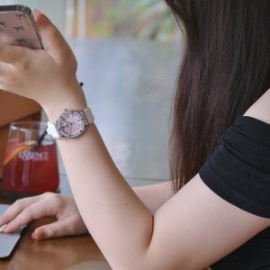 • Mặt khảm hồng sang chảnh, kết hợp viền trắng đá hiện đại, form dáng tựa chiếc Hu.blot đình đám.